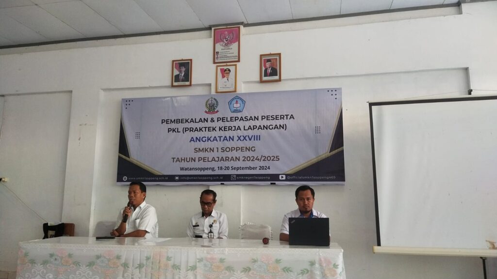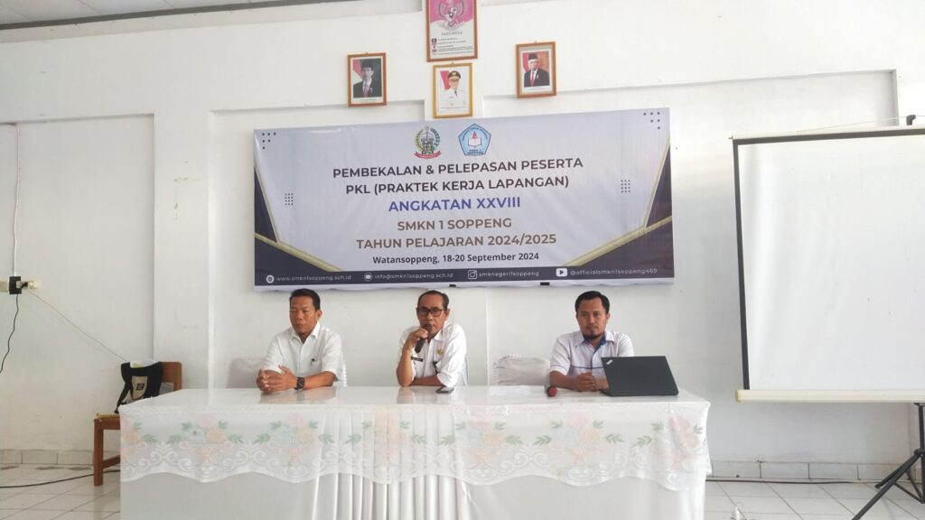 Watansoppeng, 18 September 2024 – SMK Negeri 1 Soppeng secara resmi membekali 234 siswa kelas XII untuk melaksanakan Praktik Kerja Lapangan (PKL) Angkatan XXVIII tahun pelajaran 2024/2025. Acara pembukaan yang berlangsung khidmat ini dihadiri oleh Kepala SMKN 1 Soppeng, Drs. H. Abd. Halik, M.Pd., Wakil Kepala Sekolah Bidang Humas dan Hubungan Industri, Muhammad Amin, S.Pd.,M.Pd., serta Ketua Pokja PKL, Rachmat Utomo Amir, S.Pd.,M.M.