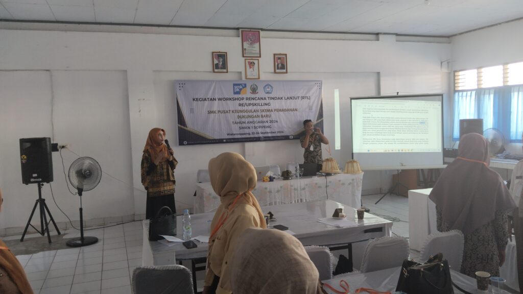 Soppeng, 23 September 2024 – Suasana penuh semangat menyelimuti SMKN 1 Soppeng selama tiga hari terakhir, 22 September -24 September 2024. Sekolah ini menjadi tuan rumah Workshop Rencana Tindak Lanjut (RTL) RE/UPSKILLING SMK Pusat Keunggulan Skema Pemadanan Baru yang diikuti oleh guru-guru Konsentrasi Keahlian Disain dan Produksi Busana dari Bone, Soppeng, Wajo, dan Sidrap.